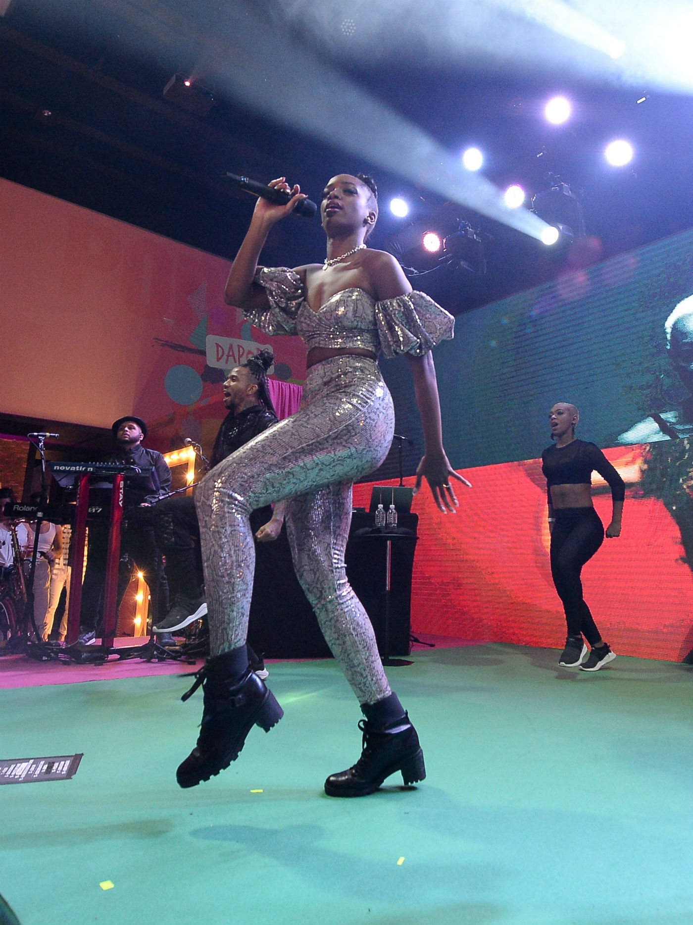 A produção poderosa da artista já mostrava ser um must have das fashionistas logo de cara, toda em animal print o conjuntinho de calça cintura alta e top cropped estampados era todo em paetês transparentes, que davam textura e um brilho ao modelito imponente.
