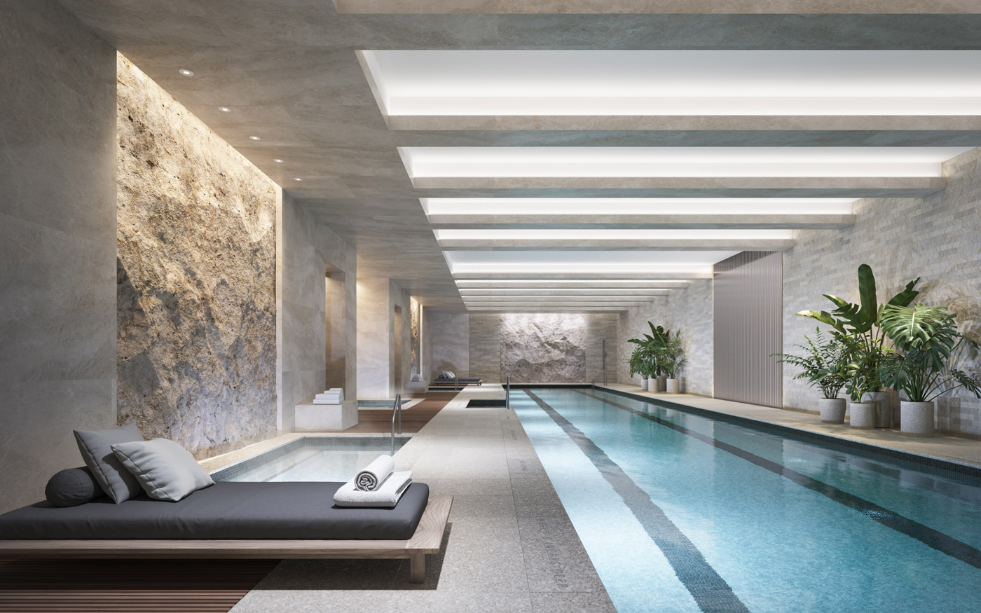 O 70 Vestry também tem uma piscina de 24 metros de comprimento, academia, salas de bicicleta, yoga e pilates, uma quadra de squash, sauna a vapor e seca e salões eventos e reuniões. Acima, o lobby de entrada.
