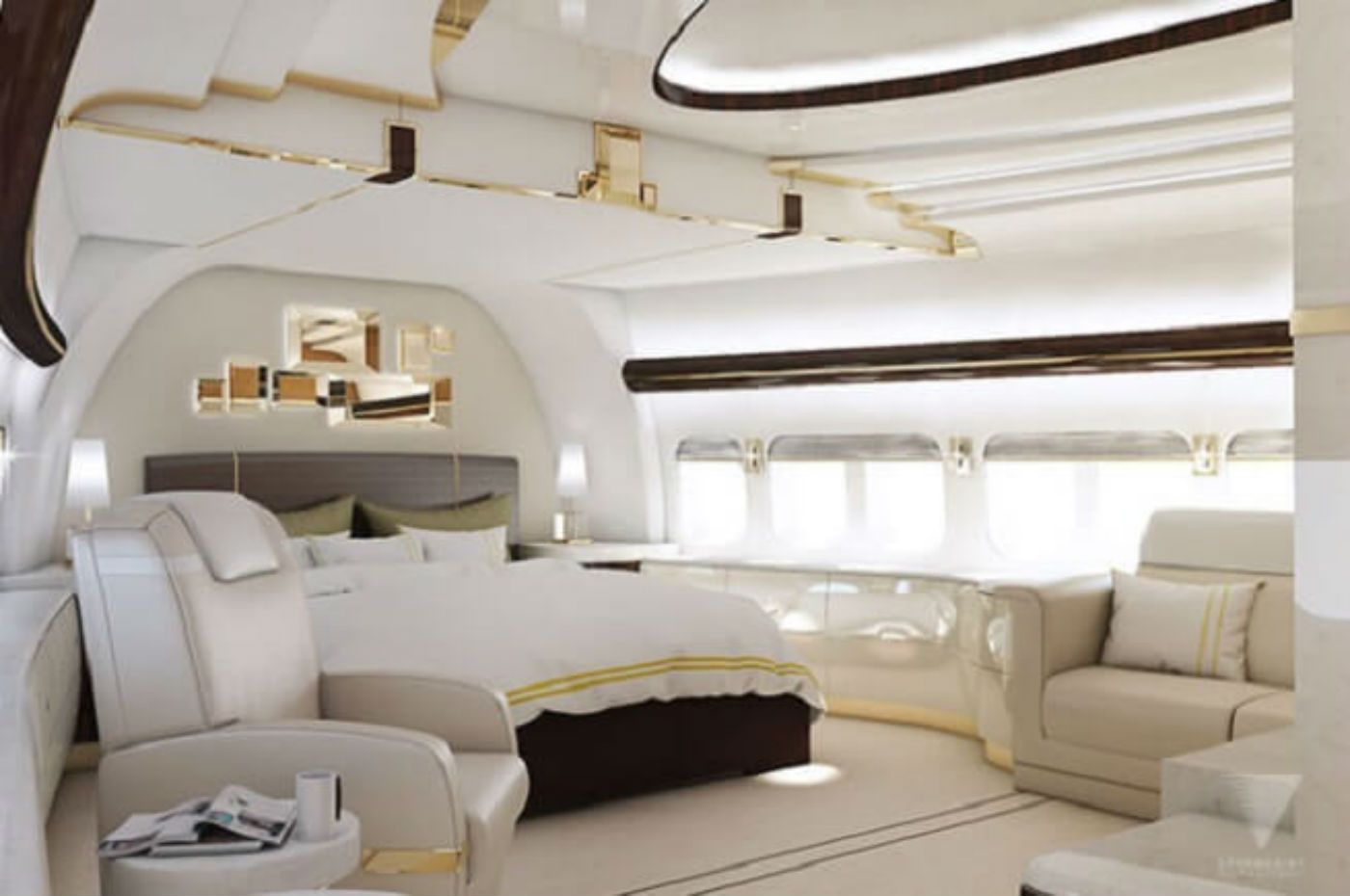 O projeto do Boeing 747-8 foi feito pela Greenpoint Technologies a pedido de um cliente confidencial e tem vários cômodos.