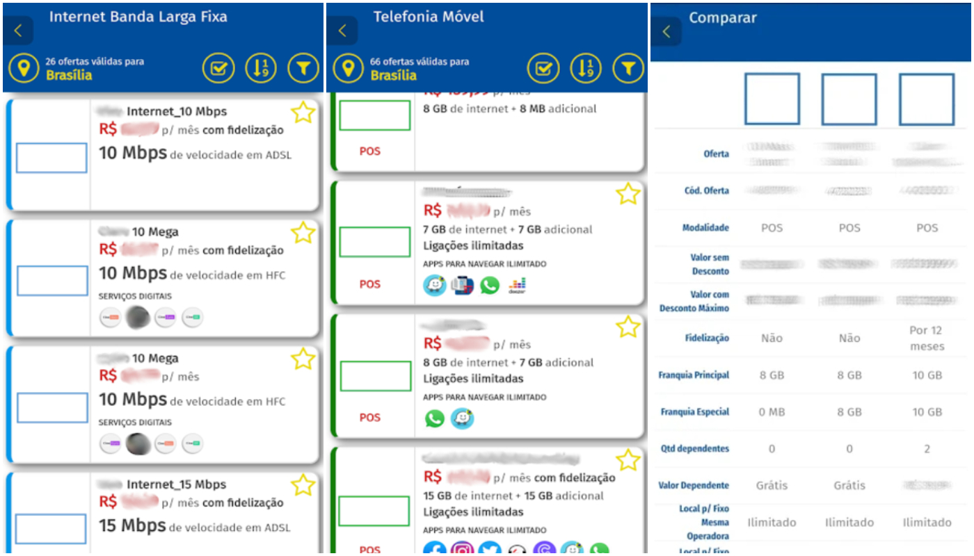 Após conferir todas as ofertas, é possível selecionar até três para comparar lado a lado. O usuário ainda poderá acessar, diretamente pelo aplicativo, o regulamento e o site da prestadora responsável por aquela oferta.