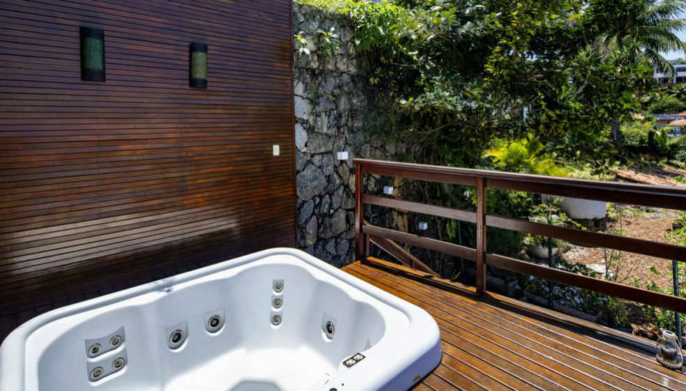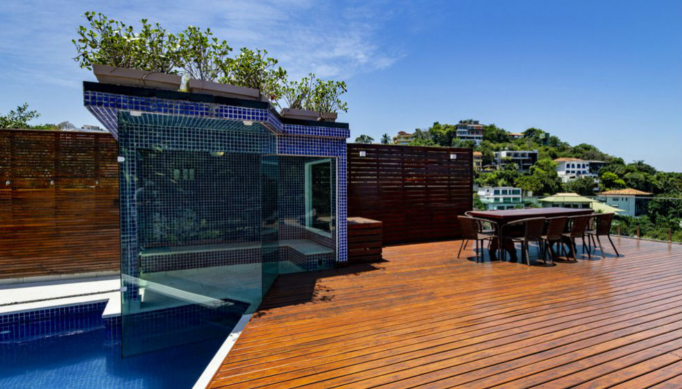 A sauna tem acesso direto à piscina, que fica em um deck de madeira, ao lado de um bar e tem vista para o mar.