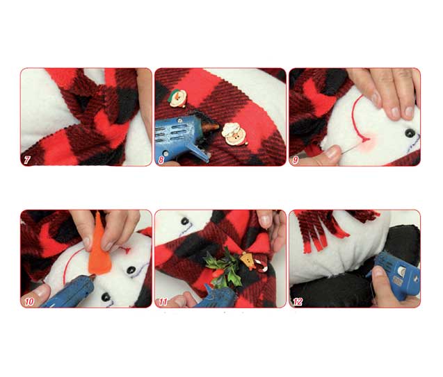 - 4 Coloque o cachecol em volta do pescoço do boneco e dê um laço. Decore, colando botões natalinos de madeira pela frente do cachecol, usando a cola quente.