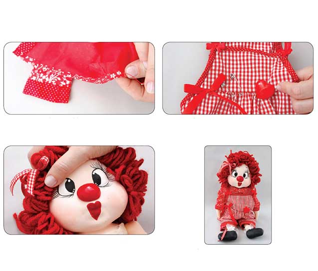 - 25 Faça um laço com fita xadrez dupla e cole na cabeça da boneca.