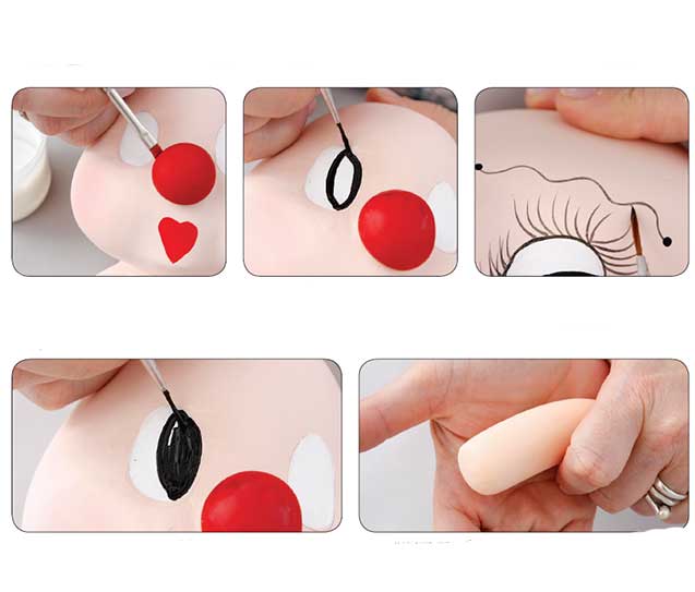 - 9 Faça uma bolinha de biscuit vermelho, achate e cole em cima do nariz com a cola branca