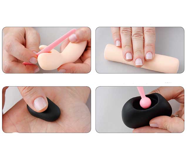 - 14 Pegue um pacotinho de 90 g de massa para biscuit na cor pele, faça um rolinho e marque o punho e achate a mão.