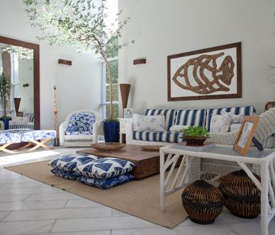 Principalmente nos quartos foram usados motivos marinhos, já que a casa se localiza próxima a um braço do mar, onde fica atracado o barco da família.