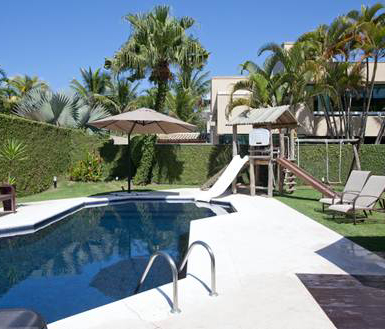 Foi criada uma casa da árvore, de onde sai um escorregador que desemboca na piscina.