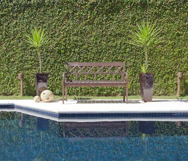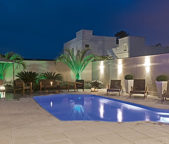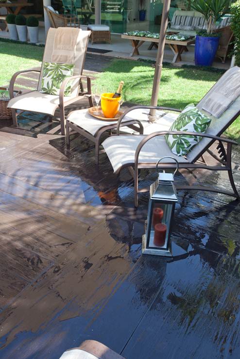 Um material que chama muita atenção é o piso atérmico colocado em volta da piscina, que não esquenta, é antiderrapante, fácil de limpar e drenante, além de bonito.