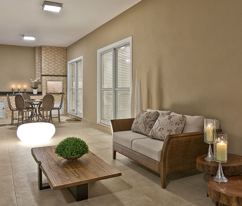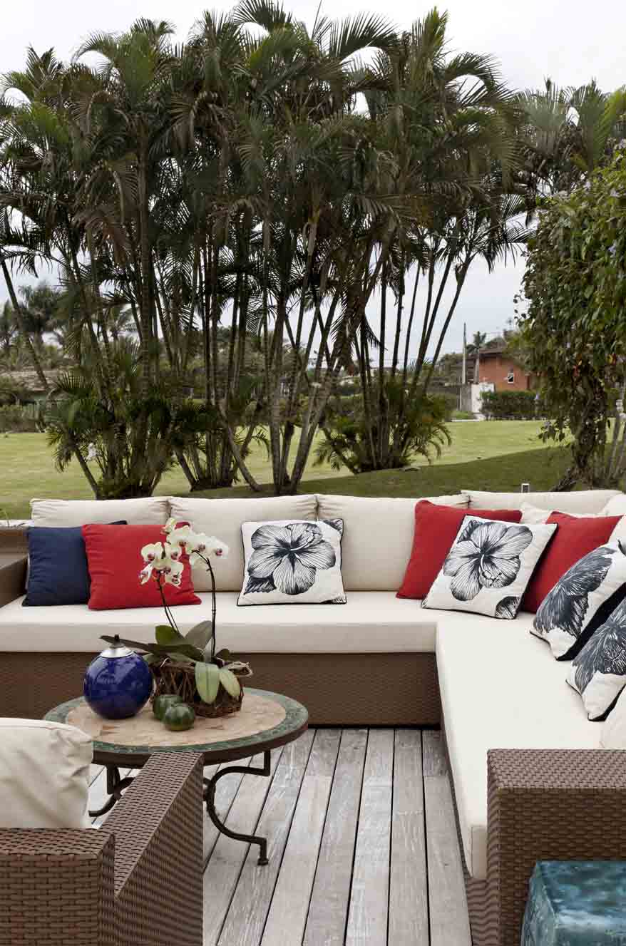 A área de descanso externa conta com um sofá em L, poltronas e almofadas na mesa combinação de cores da área interna.
