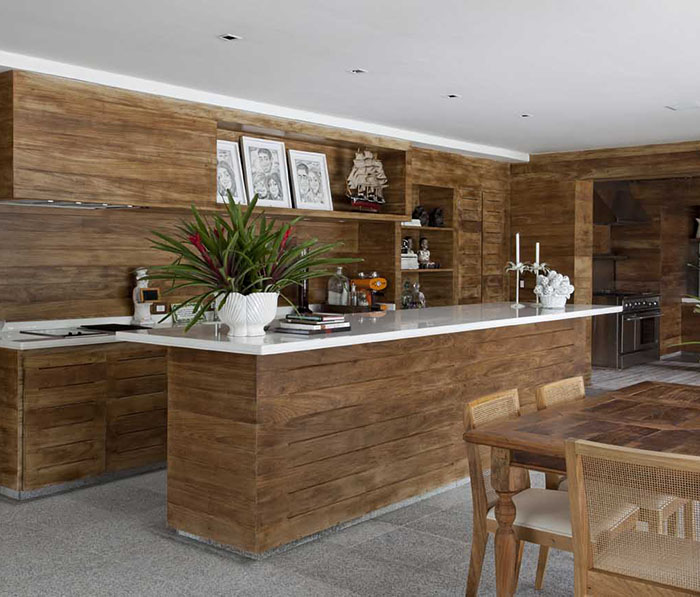 Peças, móveis e revestimentos em madeira e fibras naturais são sofisticados e bastante aconchegantes, além de traduzirem bem o espírito da casa de praia.