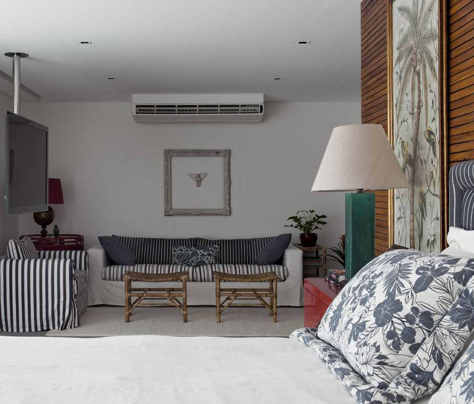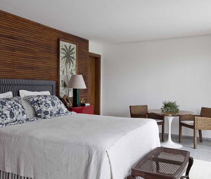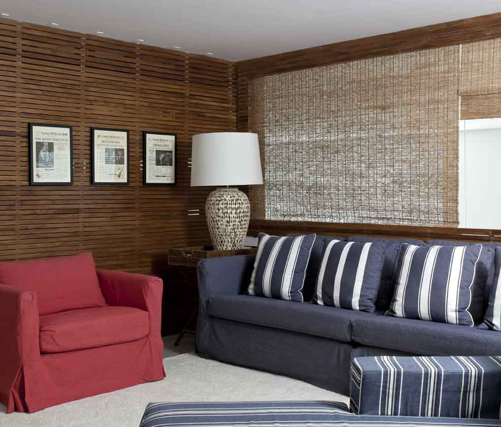 Para o mobiliário, foram utilizados madeira, ferro e vidro, com móveis antigos fundidos com outros contemporâneos e formas e cores diversificadas. A seleção de estampas de tecidos e bordados nas cores branco, azul e vermelho garantiu despojamento e sofisticação ao mesmo tempo.