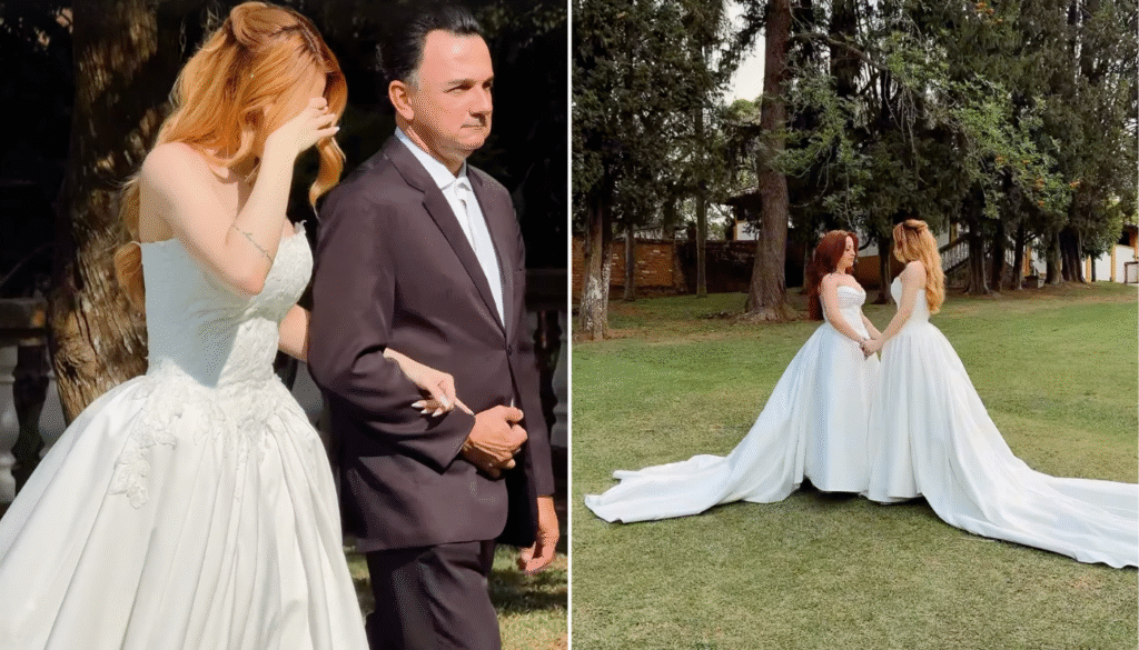 Em seu casamento com a influenciadora Júlia Ribeiro, Mari Fernandez fez questão de ter um momento a sós com a noiva. Para isso, elas contaram com a ajuda dos pais que as conduziram de olhos fechados até o local do encontro.