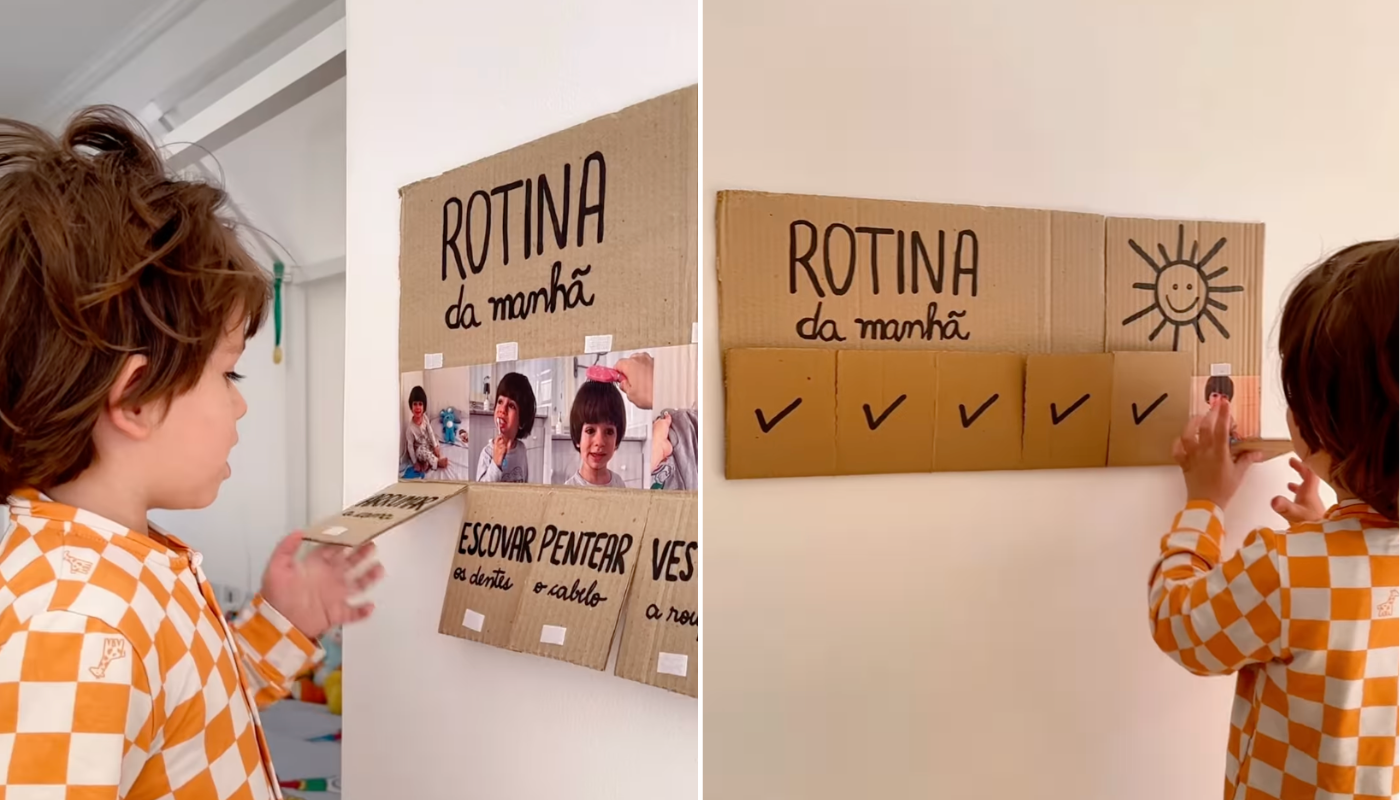 Para isso, você só precisa de um pedaço de papelão, fotos do pequeno fazendo cada atividade e velcro. A ideia é criar um quadradinho pra cada ação. Quando seu filho realizar a tarefa, será possível ocultá-la, o que vai criar a sensação de ter passado de fase. “O prazer de concluir cada etapa será uma motivação especial”, afirma a influenciadora.