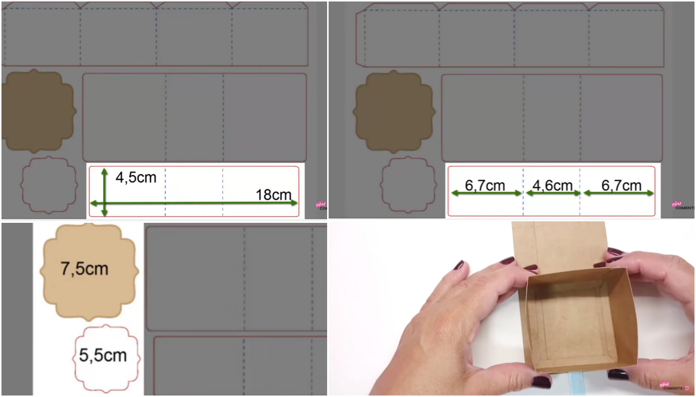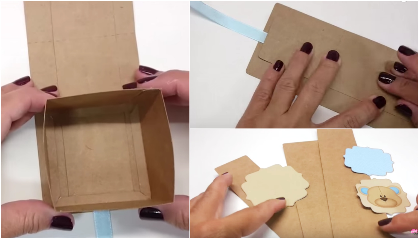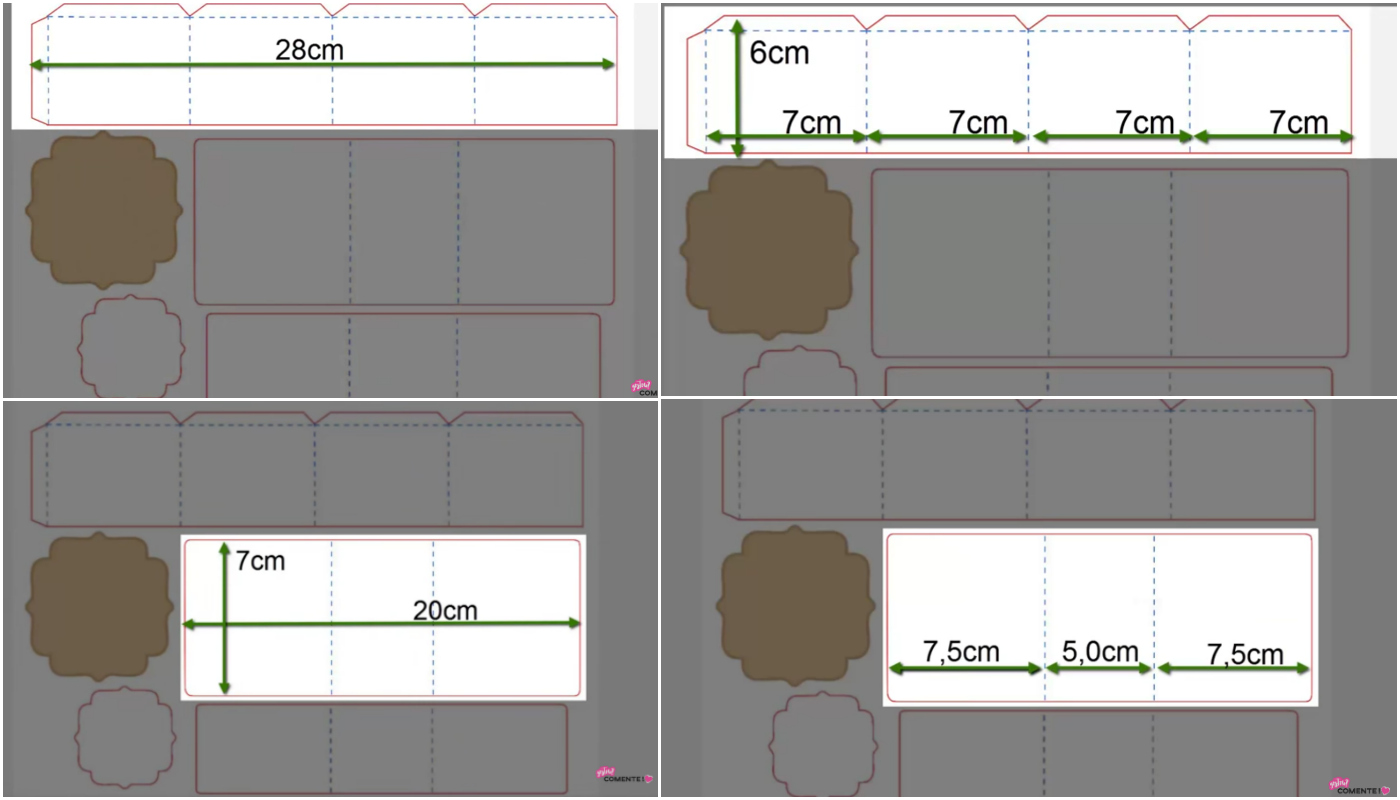 Faça todos os moldes e dobras com as medidas e vincos, como mostram as imagens acima. Meça o comprimento do retângulo “mais gordo” e tire duas medidas da fita bebê para fechar cada caixinha. Além das duas molduras cheias de adornos que estão no molde e vão por cima para enfeitar, você também precisa escolher a cor e o tema da sua lembrancinha.