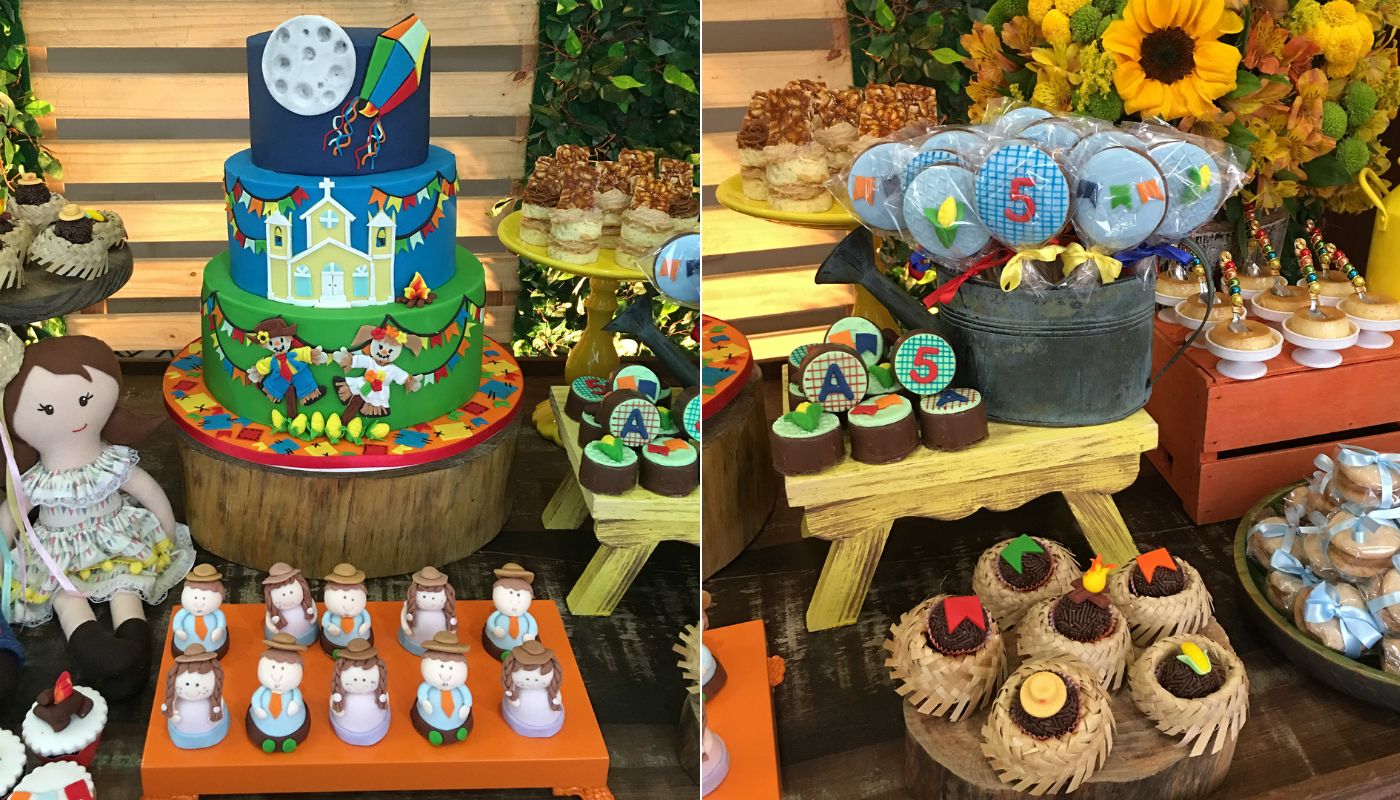 O bolo para o pequeno Artur também era temático e foi feito pela Cake 4 Us. Com 3 andares, possuía desenhos como balões, uma igreja e personagens dançando a quadrilha. O que também não podia faltar eram os chapéus de palha, para lembrar os caipiras.
