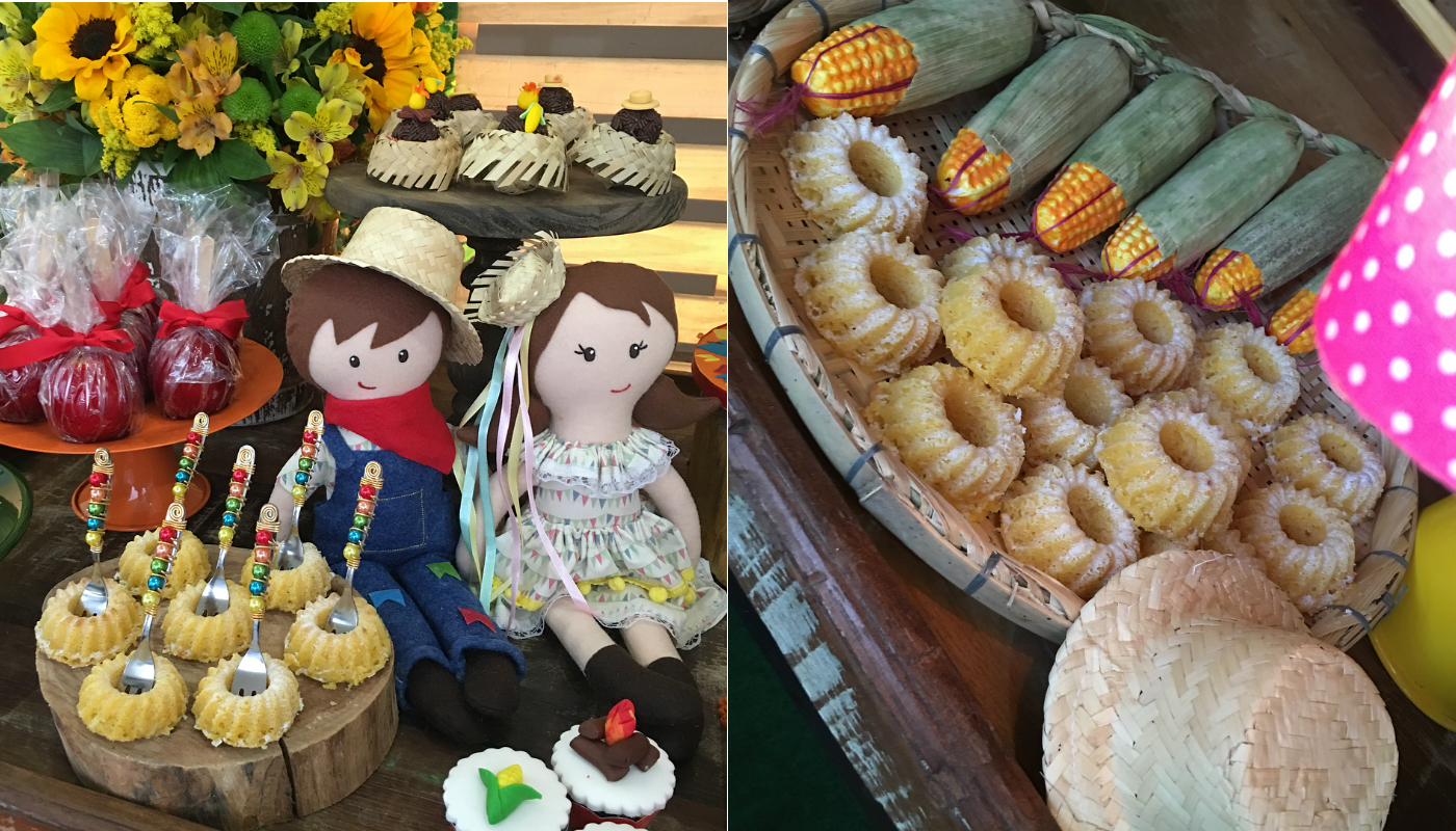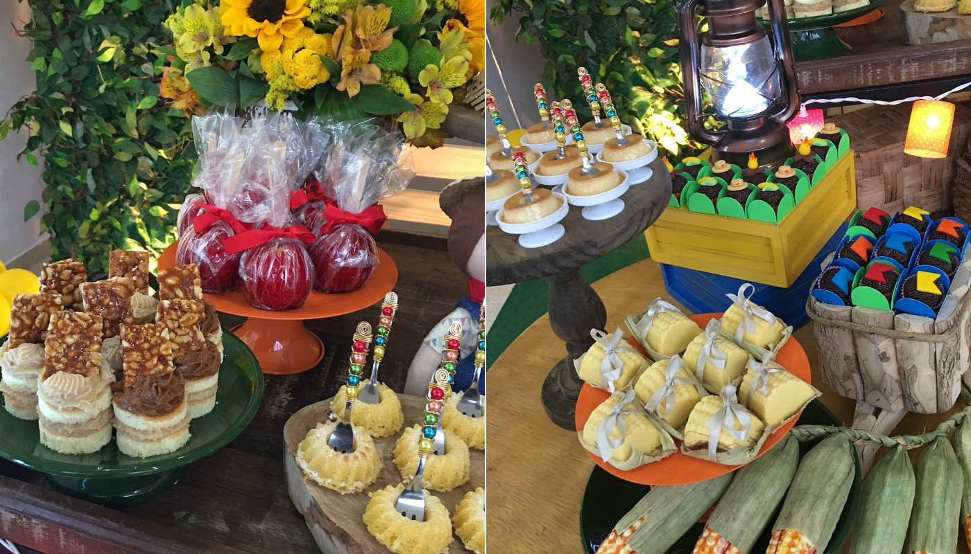Os doces servidos são típicos da época. Espalhados pela mesa, havia pipoca de diferentes sabores, brigadeiro com chapéu colorido por cima ou bandeirinhas, pudim com colheres coloridas, pé de moleque em cima de bolos, maçã do amor e milho decorado com laços.