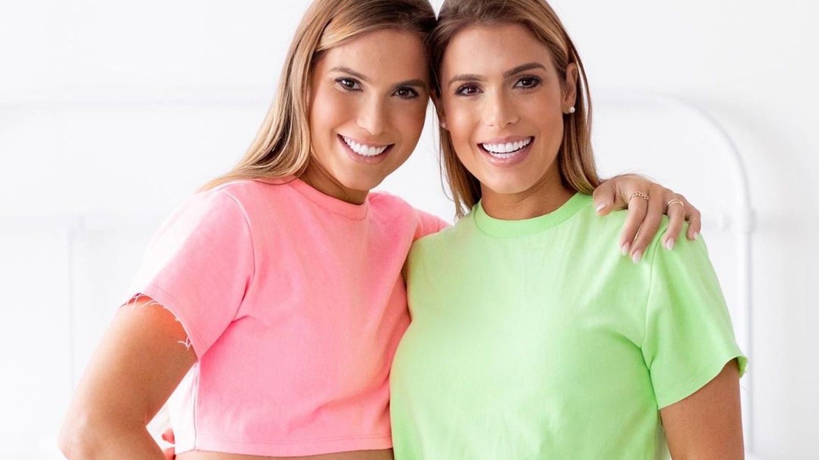 Com conjuntinhos em neon que roubaram a cena nos cliques, as irmãs nadadoras acariciaram as barrigas e deixaram à mostra a diferença nos tamanhos.