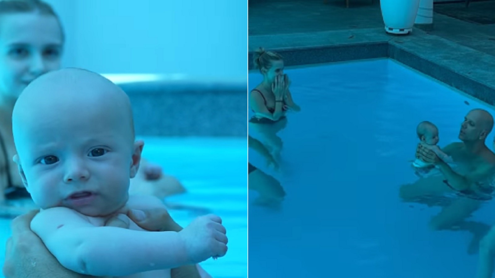 No álbum aberto pela mamãe coruja no Instagram, os pequenos aparecem no colo dos pais embaixo do chuveiro, dentro da piscina e, finalmente, em vídeo, apenas brincando na água com o avô, que é medalhista olímpico de natação.