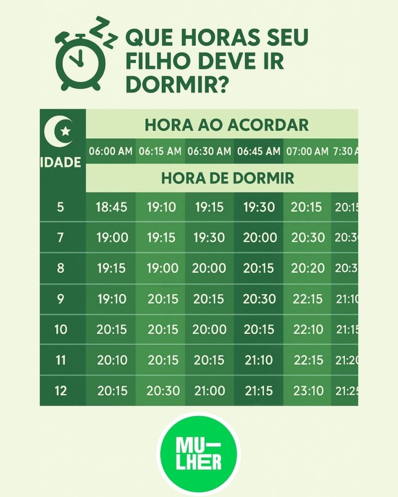 Os médicos recomendam que crianças de 3 a 6 anos tenham entre 10 e 12 horas de sono por dia. E crianças de 7 a 12 anos deveriam dormir entre 10 e 11 horas. Isso para que elas mantenham um desenvolvimento físico e emocional saudável. A tabela criada pela educadora, portanto, ajuda de forma prática como realizar a rotina. Confira abaixo hora exata que seu filho precisa ir dormir segundo a idade dele: