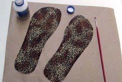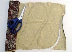 PASSO 2: Com o solado da base virado para cima, risque o tecido, usando um lápis de ponta macia. Com um pincel, passe a termolina na margem do risco e aguarde a secagem. Corte seguindo o risco.