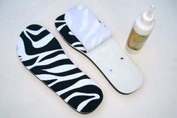 PASSO 11: Pré-aqueça o ferro de passar na temperatura algodão, proteja a base da sandália com um pano, para não sujar o ferro, coloque-o em cima da base por 5 a 6 segundos, para fixar mais a cola. Espere esfriar e monte suas Havaianas.