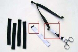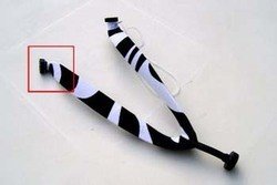 PASSO 6: Corte 4 tiras de 3,5 cm x 15 cm do tecido que irá usar nas tiras das Havaianas. Essas medidas são para o tecido de lycra, que estica (1). Feche no comprimento com uma dobra de 0,5 cm em uma das pontas, para facilitar no acabamento. Com a ajuda de uma pinça ou até mesmo um alicate de ponta longa, deixe a ponta com a dobra para frente e forre as tiras da Havaianas (2).