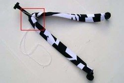 PASSO 8: Com uma agulha grossa e 4 fios de linha, passe pelo tecido, pela tira da havaiana e volte para o tecido.