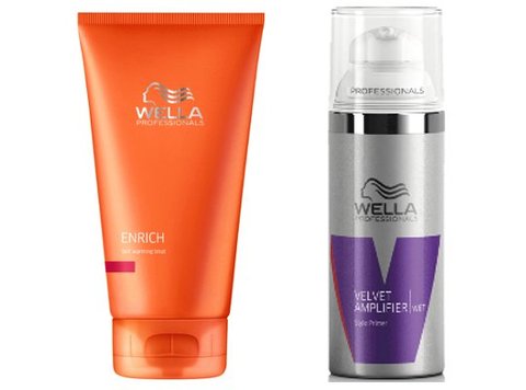 Enrich Self Warming, da Wella, que revitaliza todas as texturas de cabelo e Velvet Amplifier Primer, da Wella, que é o 1º primer para styling do mundo/ Preço sugerido: Enrich Self Warming (R$ 67,50) e Velvet AmplifierPrimer (R$ 61,50)