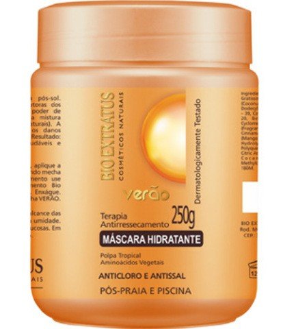Máscara Hidratante (Linha Bio Extratus Verão): o produto promove hidratação intensiva pós-sol e possui alto teor de agentes quelantes, substâncias que atraem os íons do sal e do cloro, retirando assim, os seus excessos. A linha é indicada para uso pós-praia e piscina. Aplique no comprimento e pontas do cabelo higienizado e massageie para distribuir em toda a extensão. Deixe agir de três a cinco minutos e enxágue. Preço sugerido: R$ 14,43 (250g). SAC Bio Extratus: (31) 3855-3002.