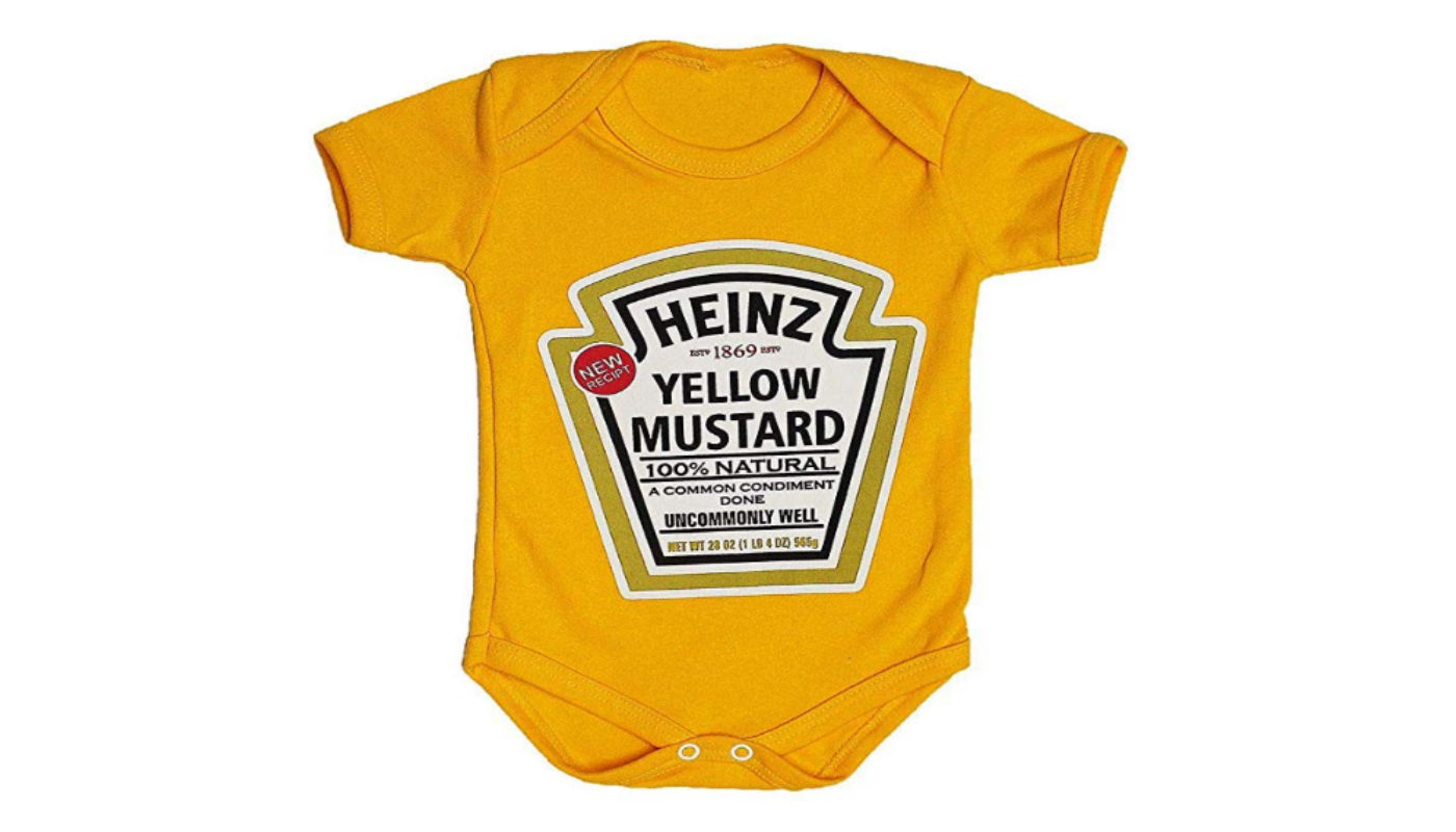 Um opção de roupinha para bebês, por exemplo, é esta fantasia de mostarda Heinz da Dragon Store, à venda na Amazon por R$ 34,06* (compre aqui).
