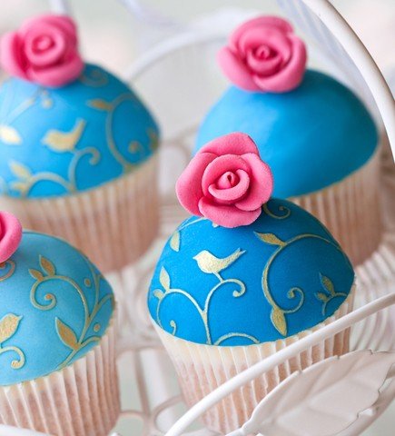 Para quem gostou do azul nos doces, mas não quer comprometer o bolo de casamento, uma boa ideia é apostar nos cupcakes. Aproveite que esses bolinhos estão na moda e, quanto mais criativa a cobertura, melhor. O da foto combina turquesa, dourado e estampa de pombinhos: mais fofo, impossível!