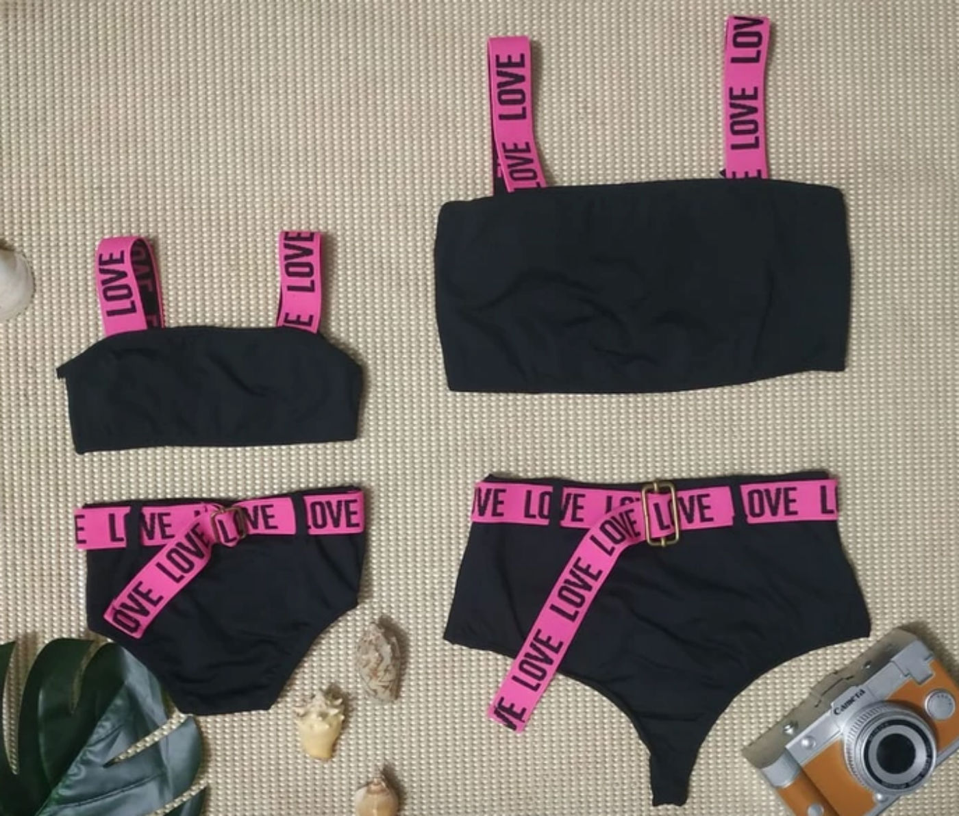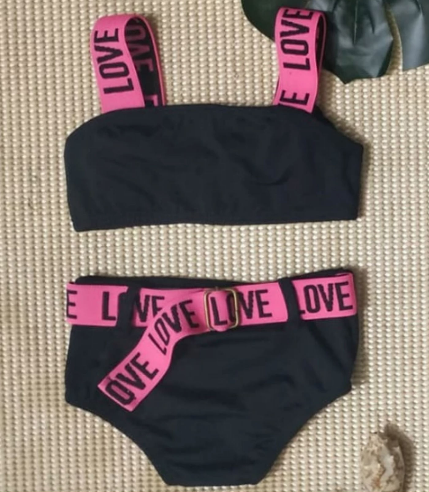 Suas partes de cima são compostas por tops de corte reto que estão na moda, os quais são sustentados por alças largas estampadas com a palavra “Love” (“Amor”, traduzindo do inglês para o português).
