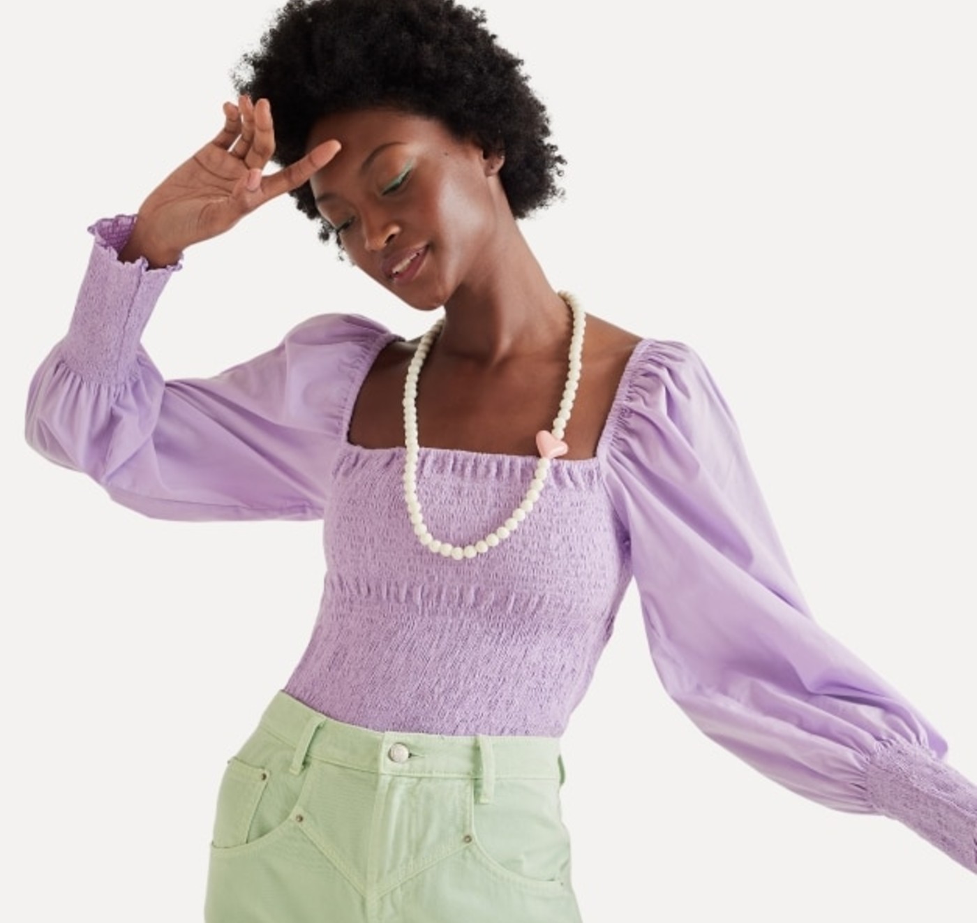 Ewbank posou ao ar livre para um clique publicado em seu perfil no Instagram e o seu look chamou a atenção. O destaque do visual ficou para a sua blusa lilás com mangas bufantes, elemento que é tendência de moda para o verão.