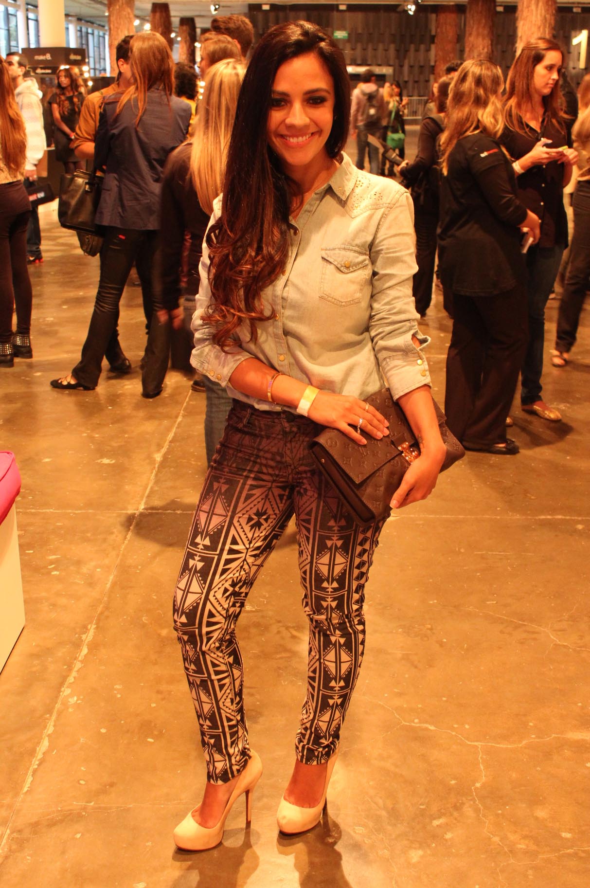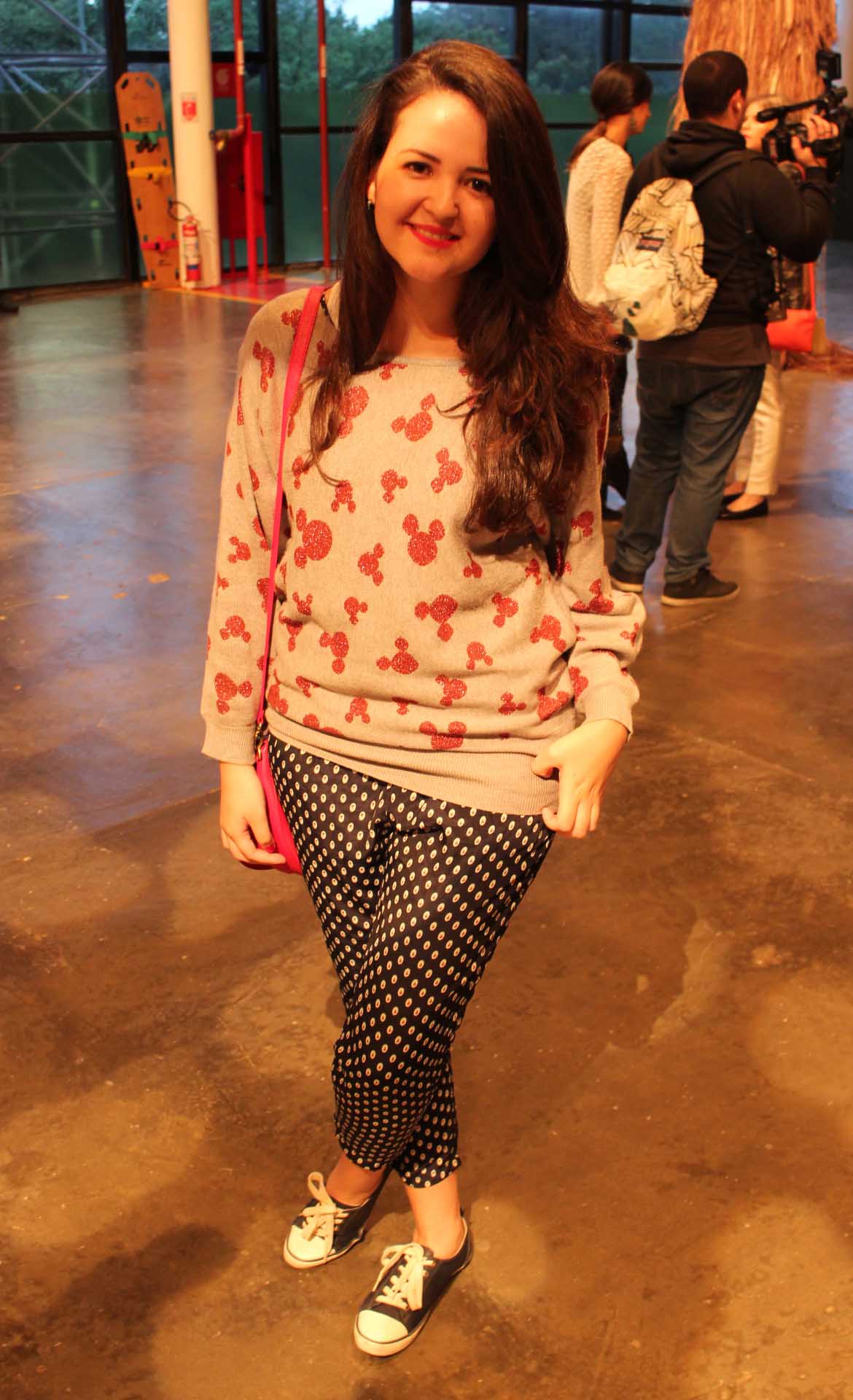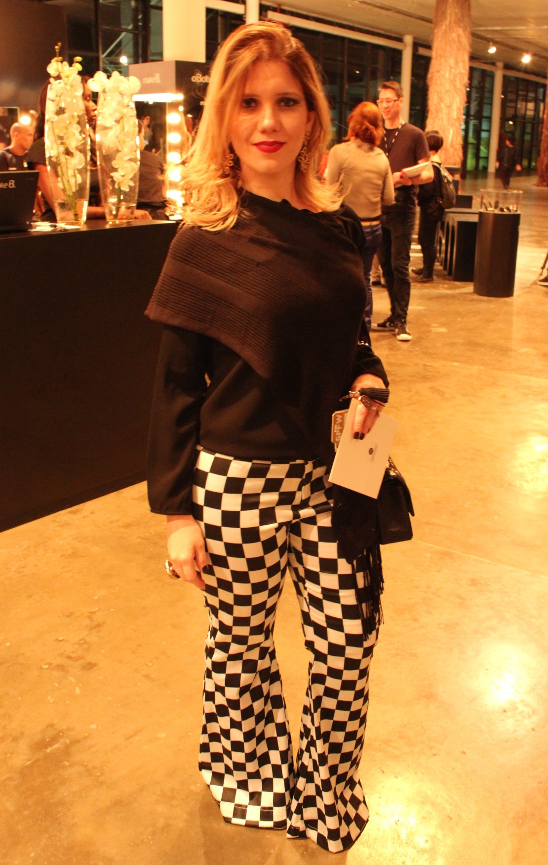 A jornalista Patrícia Ventura aproveitou a cobertura do evento para também apresentar seu modelito. A calça é preta com bolinhas brancas