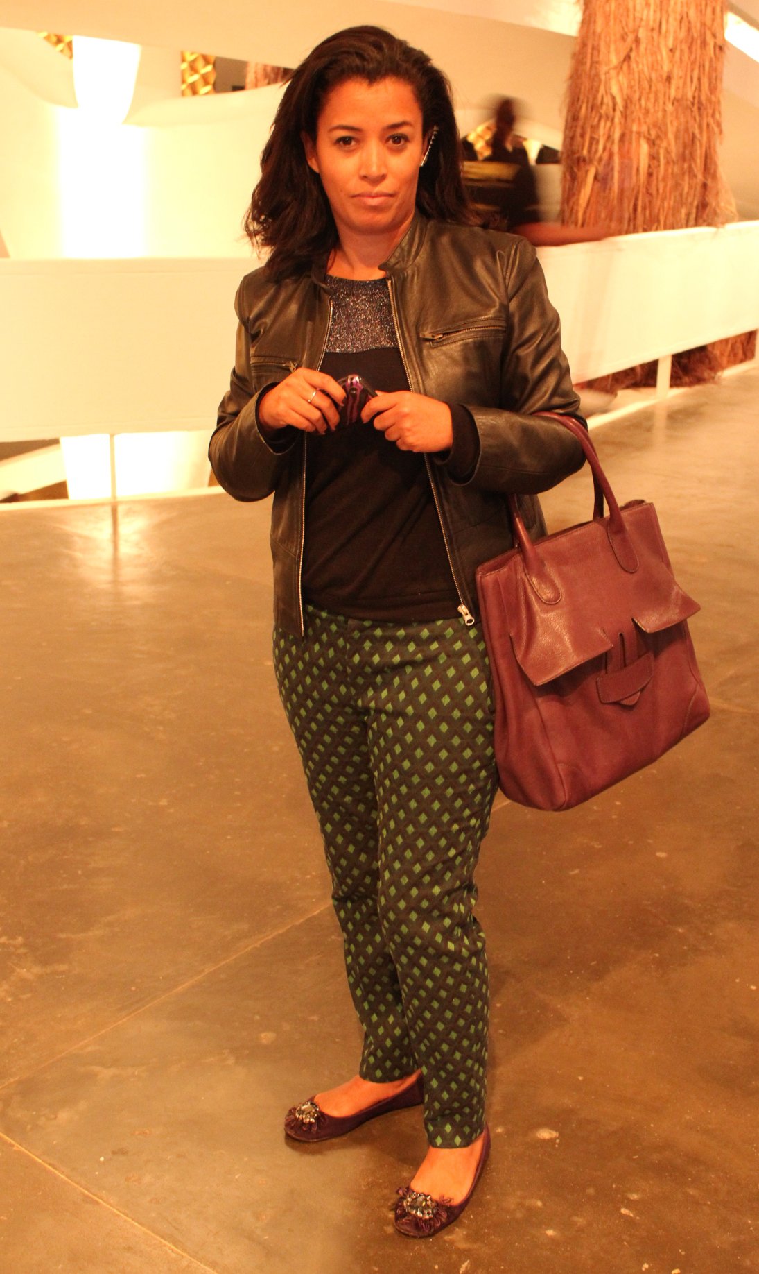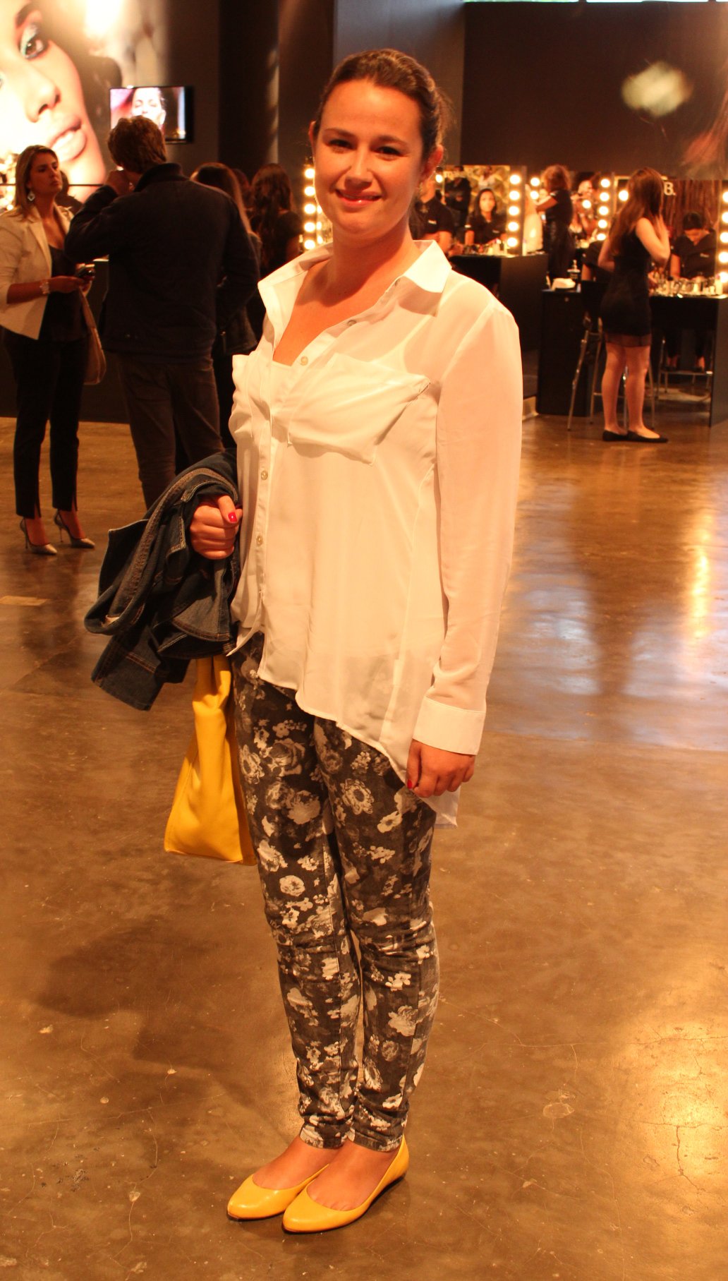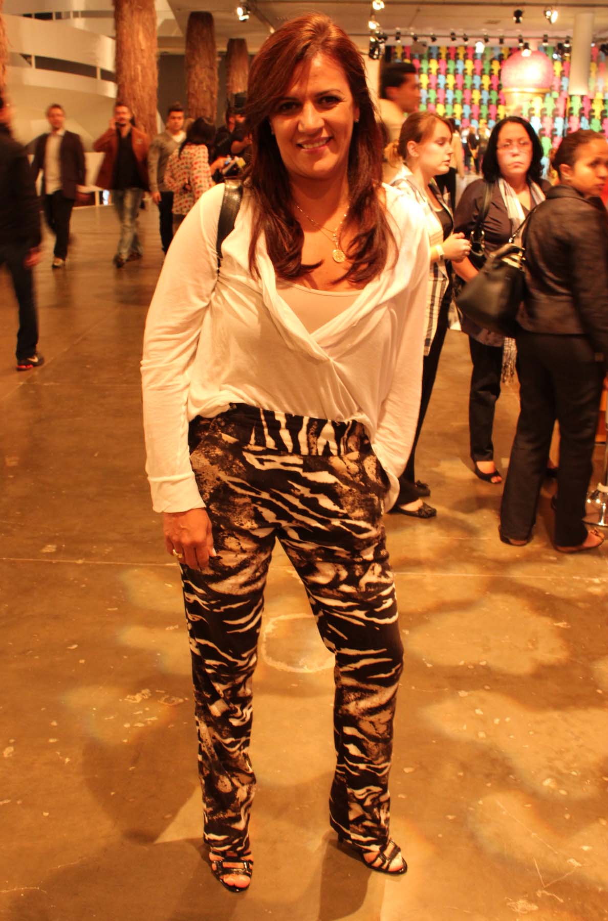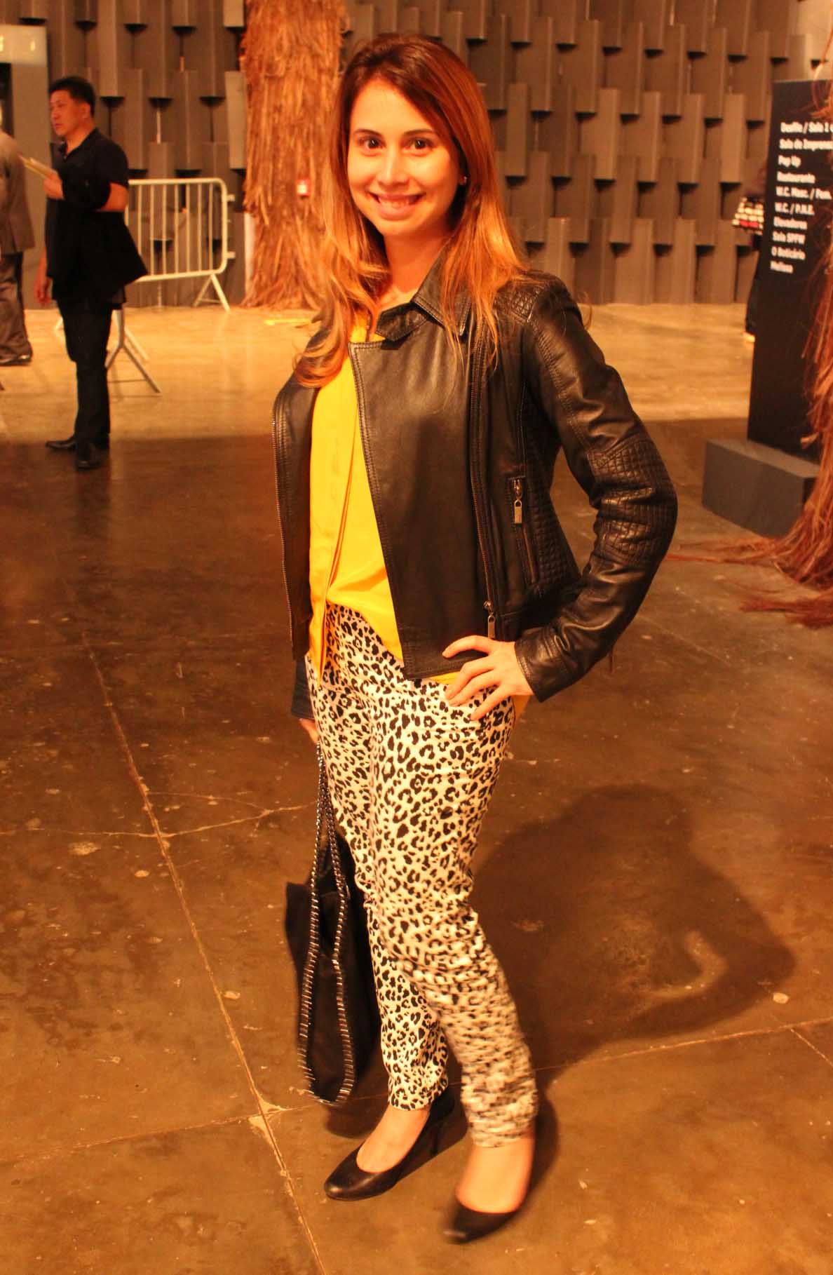 A jornalista Patrícia Ventura aproveitou a cobertura do evento para também apresentar seu modelito. A calça é preta com bolinhas brancas