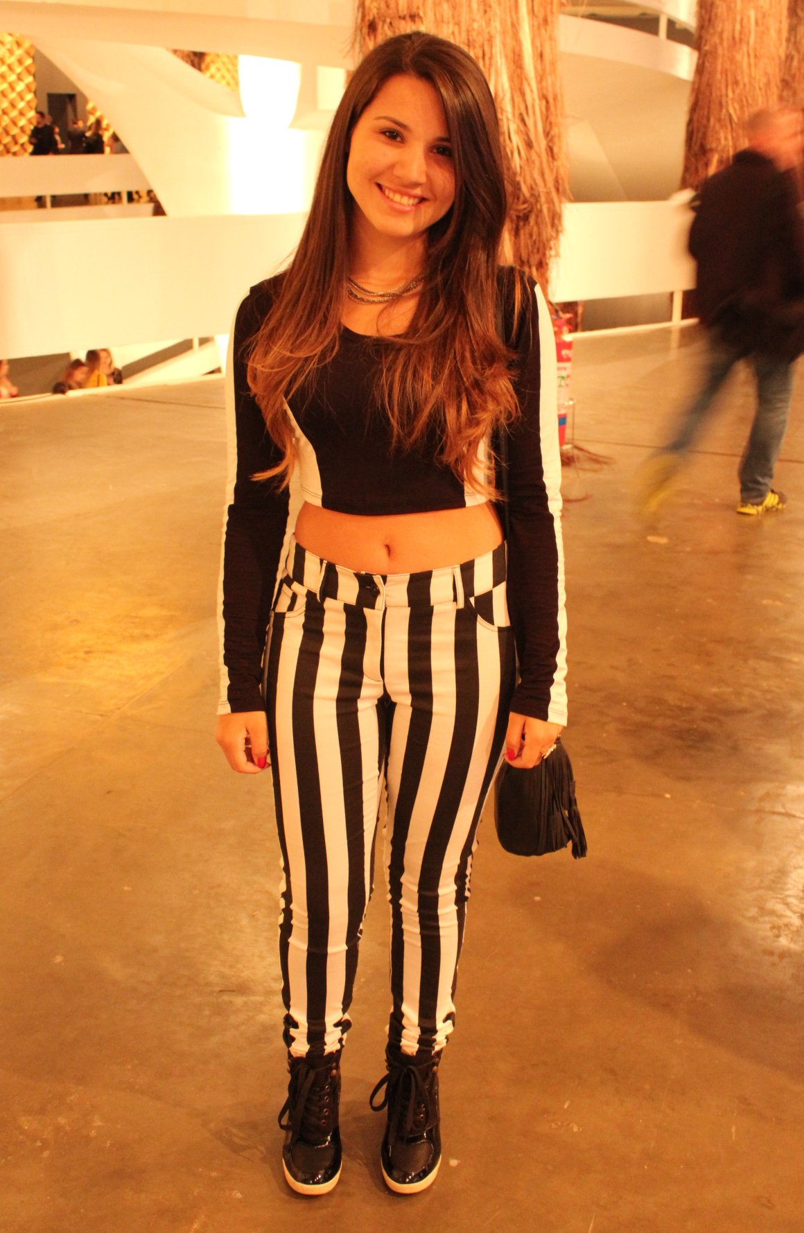 Maysa Faggion ousou. A estudante desfilou pelos corredores do SPFW de barriguinha de fora e uma calça com listras verticais