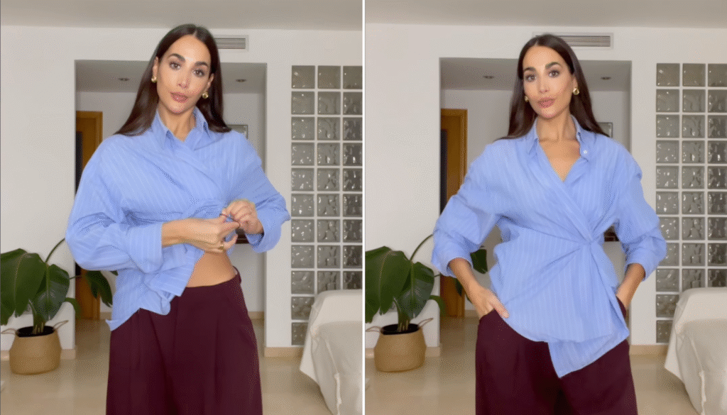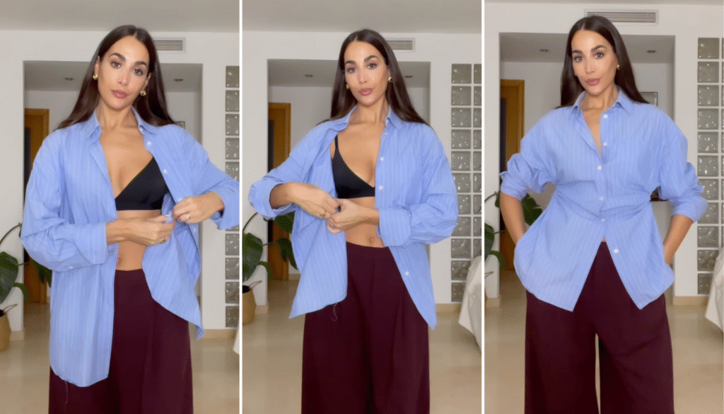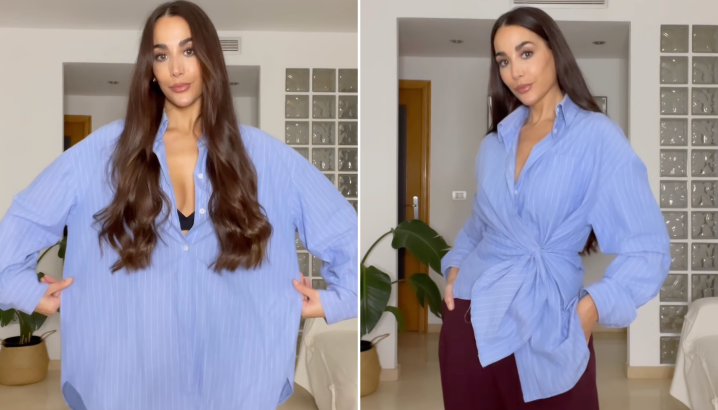 Em um vídeo no Instagram, Tania Ayuso mostrou três maneiras de estilizar a camisa oversized usando apenas elástico de cabelo e um alfinete de segurança. Veja como!