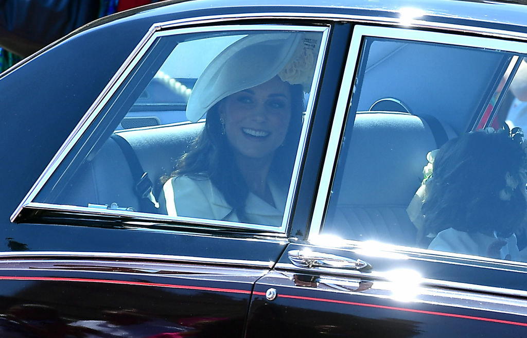 A Duquesa de Cambridge usou um vestido de cor bem clara e tamanho midi ajustado na cintura. Ao invés de um fascinator pequeno, ela usou um acessório grande, quase um chapéu, bem reto e diagonal na cabeça.