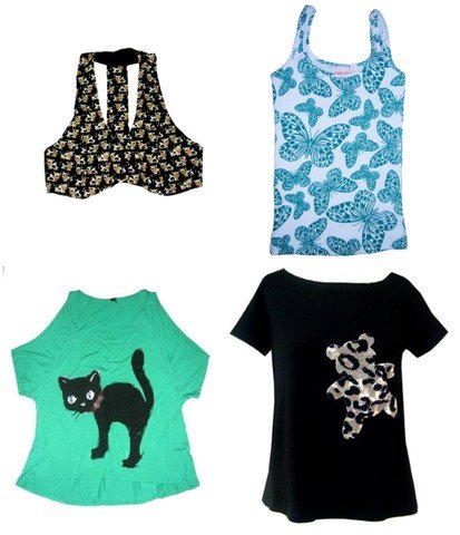 Só animais fortes? Não! Estes são fofinhos, fofinhos! Marcas: Super Santa (colete), Mercatto (camiseta borboletas), Pathisa (as T-shirts)