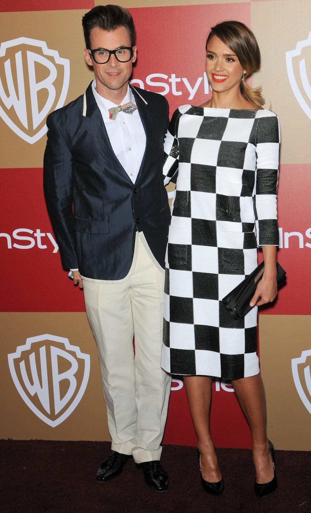 Jessica Alba apostou em um vestido bem comportado, com estampa quadriculada em preto e branco, lembrando um tabuleiro de xadrez. Com mangas compridas e saia abaixo do joelho, o vestido destoa do estilo usual da atriz, que costuma usar peças bem sexy.