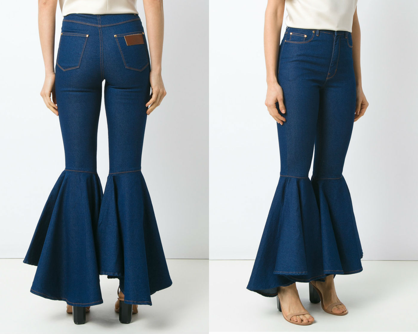O modelito de Eliana é comprido e justinho ao corpo, mas dos joelhos para baixo possui uma barra bem volumosa, plissada e levemente assimétrica. A peça de cós alto também possui bolsos frontais e posteriores.