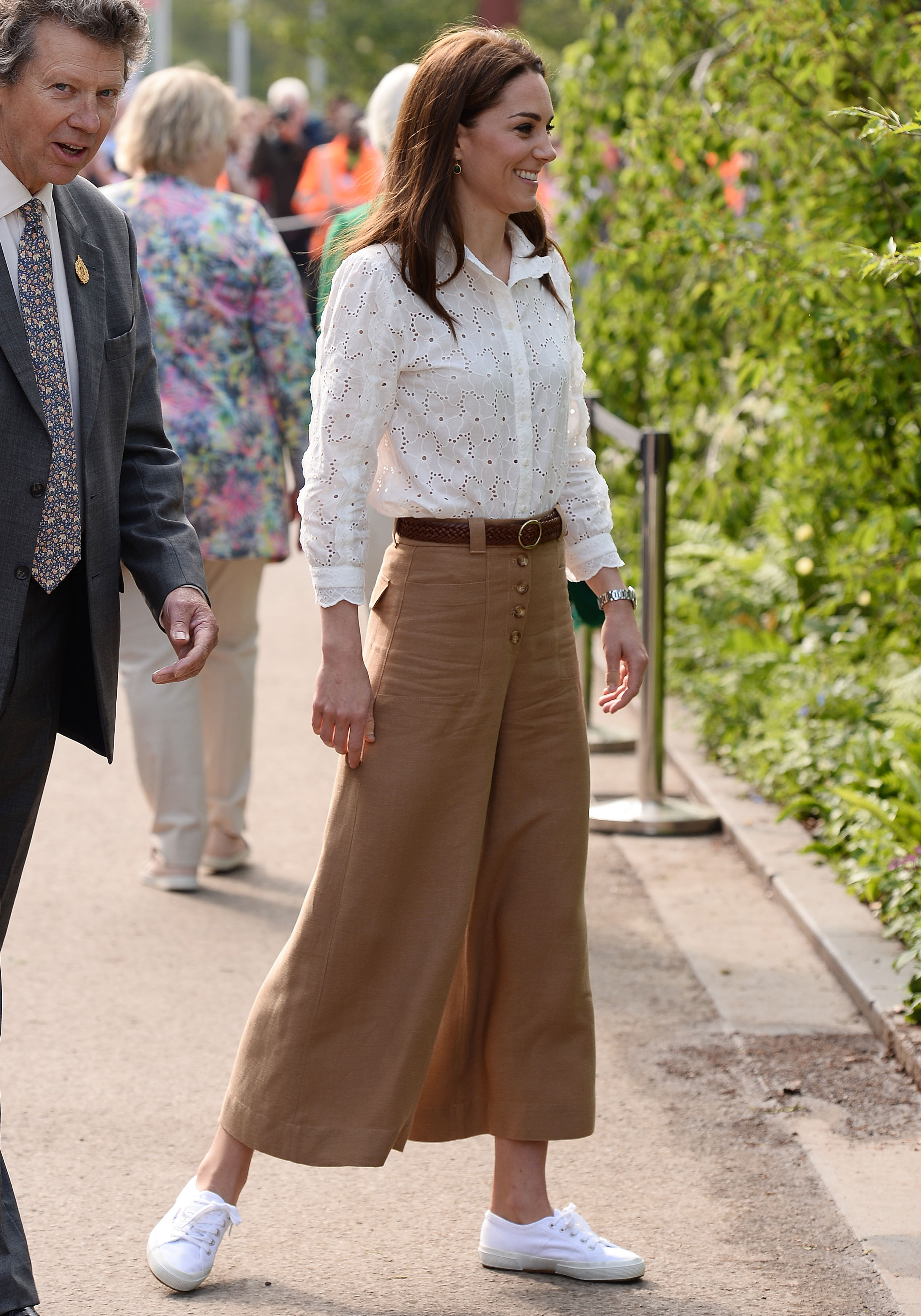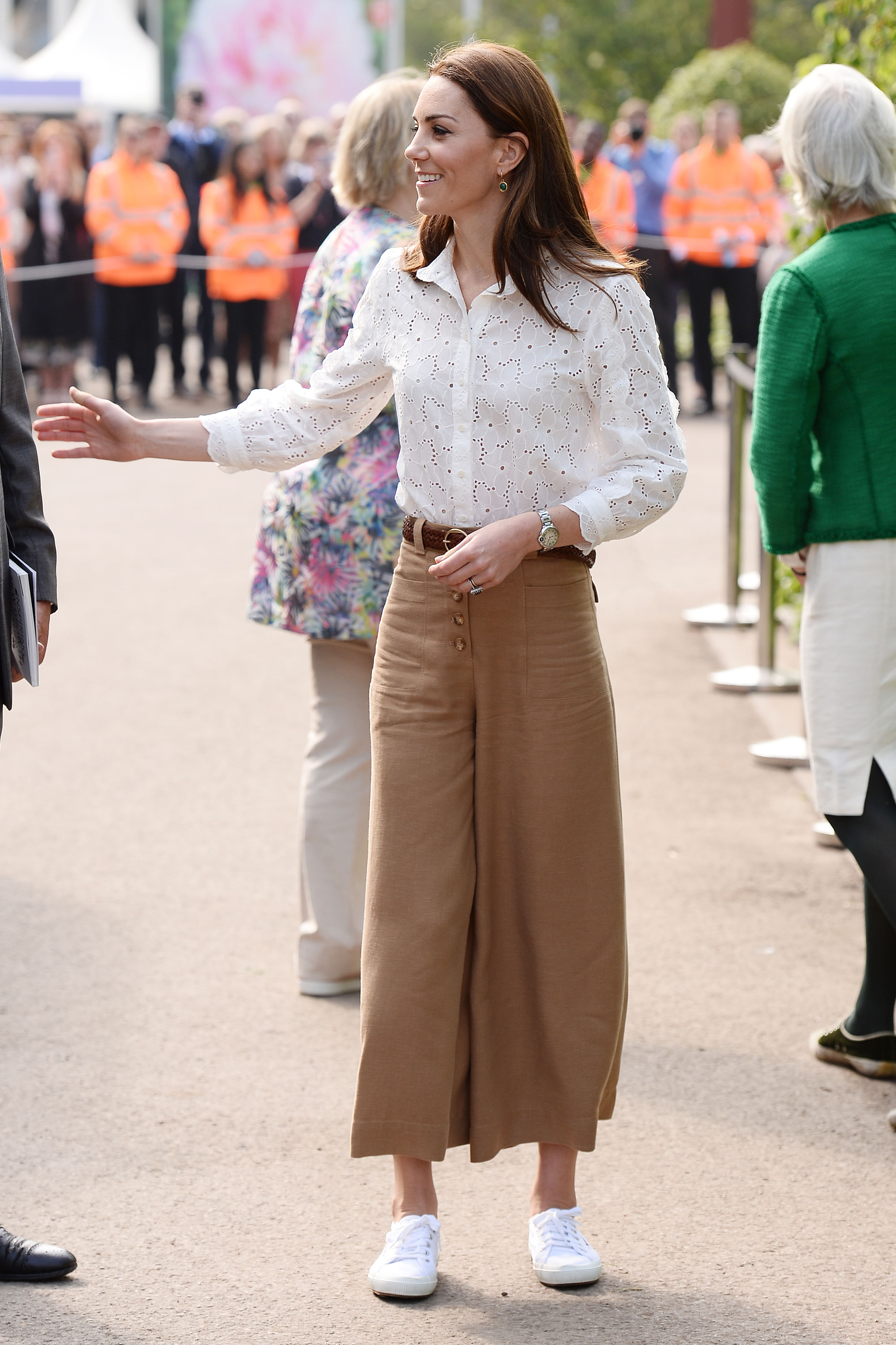 Para visitar um jardim e participar de atividades ao ar livre, a esposa do Príncipe William elegeu uma delicada camisa branca de renda que foi usada junto com uma calça que está na moda e um tênis branco basiquinho que vende até mesmo no Brasil. Veja em detalhes: