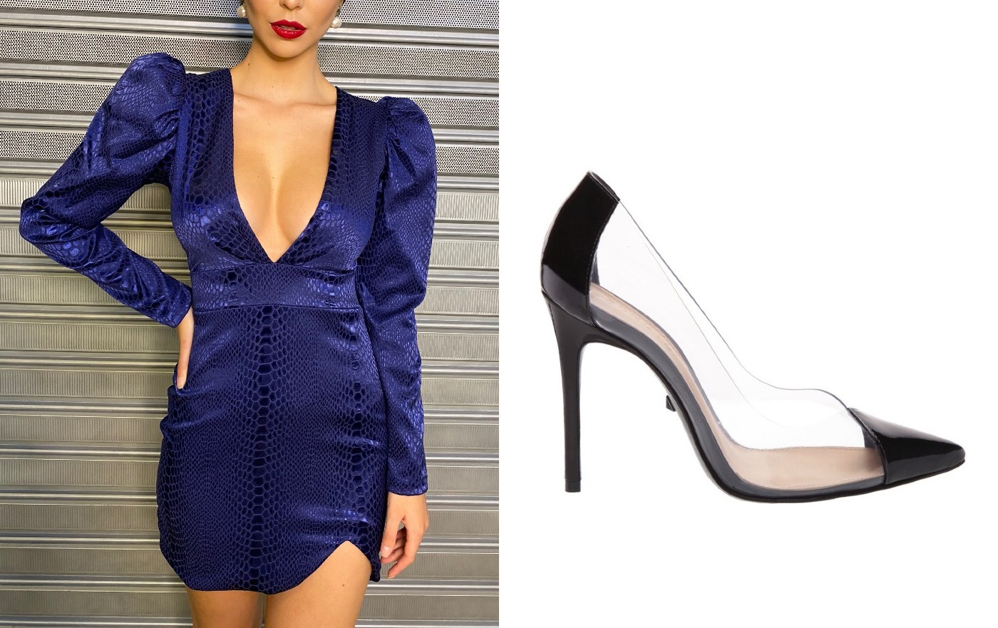 Ana Clara também investiu em um sapato que é febre entre as brasileiras, um scarpin com detalhes em vinil. O par possui salto agulha e um detalhe geométrico preto apenas no bico, o que contrasta com as laterais transparentes do calçado. O modelito faz parte de uma coleção antiga da marca Schutz.