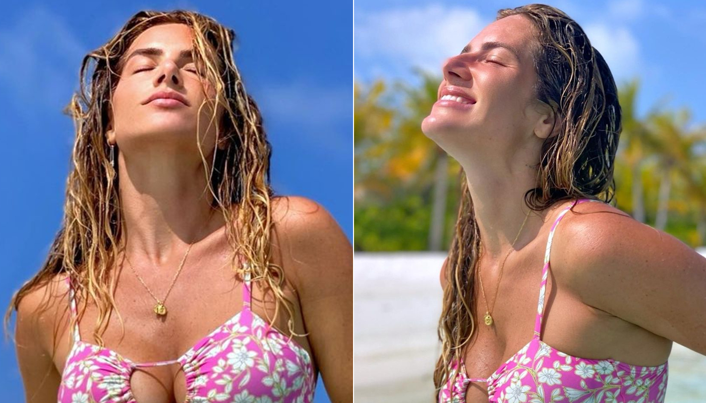 A atriz, que costuma aparecer em cliques nas redes sociais usando conjuntos de biquínis, dessa vez surgiu com um maiô bem diferente, com direito a amarração na frente e hot pant cavada.