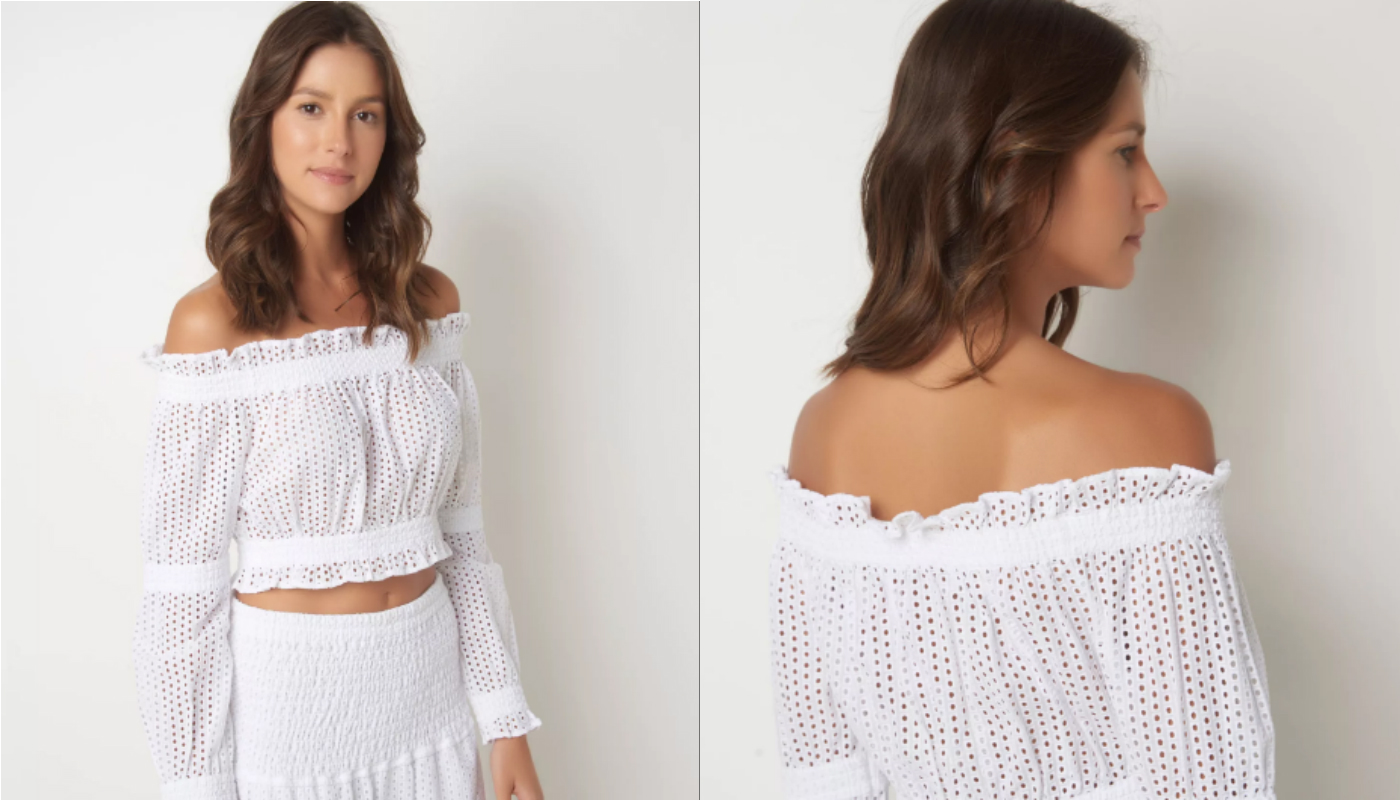 Com os cabelos soltos e make básica, a atriz apostou em um top cropped ciganinha, de ombros de fora. O modelo, de mangas longas, era folgadinho com elásticos na cintura e no colo, seguido por babadinhos discretos. A peça é toda vazada, o que dá frescor.
